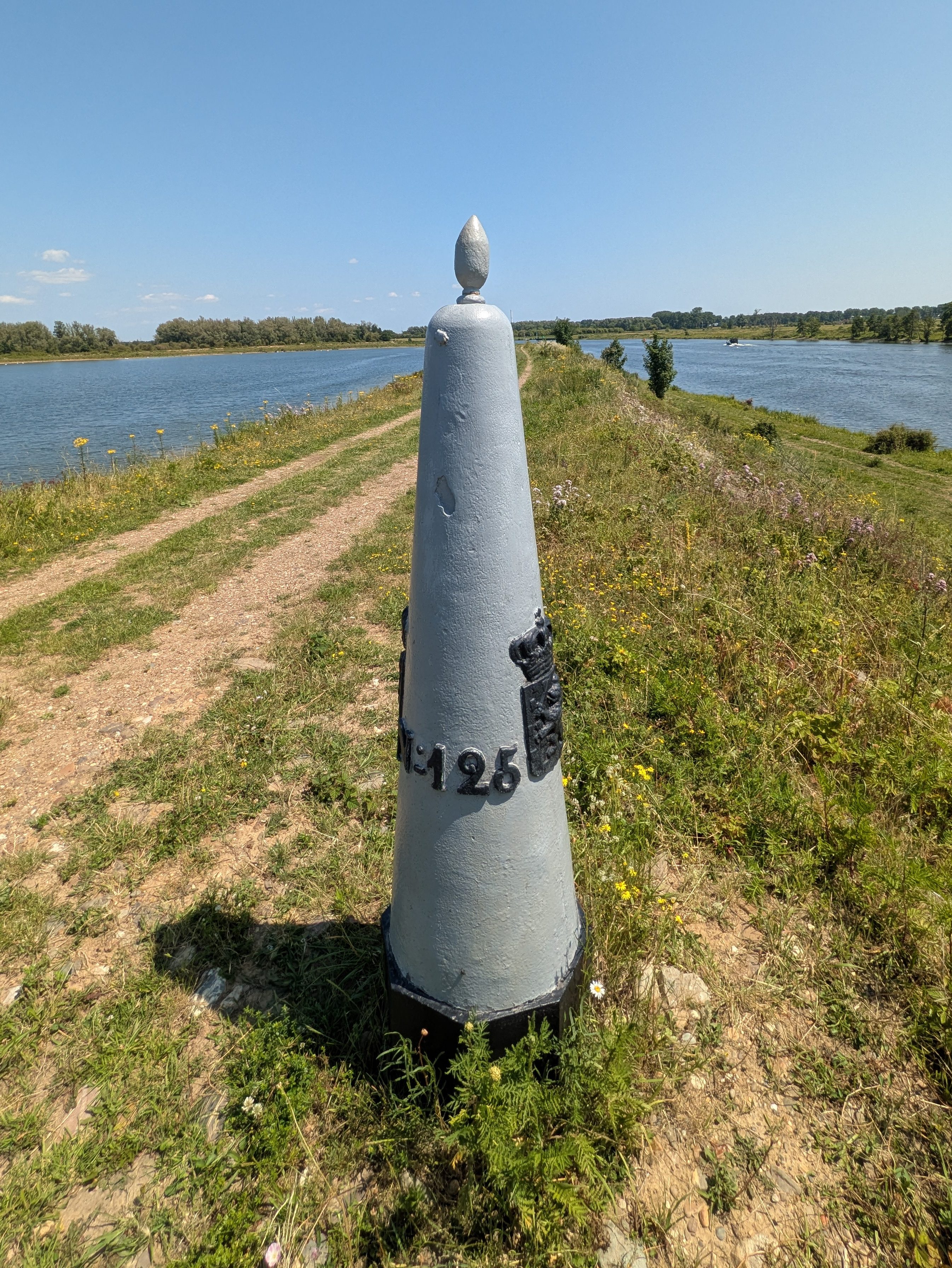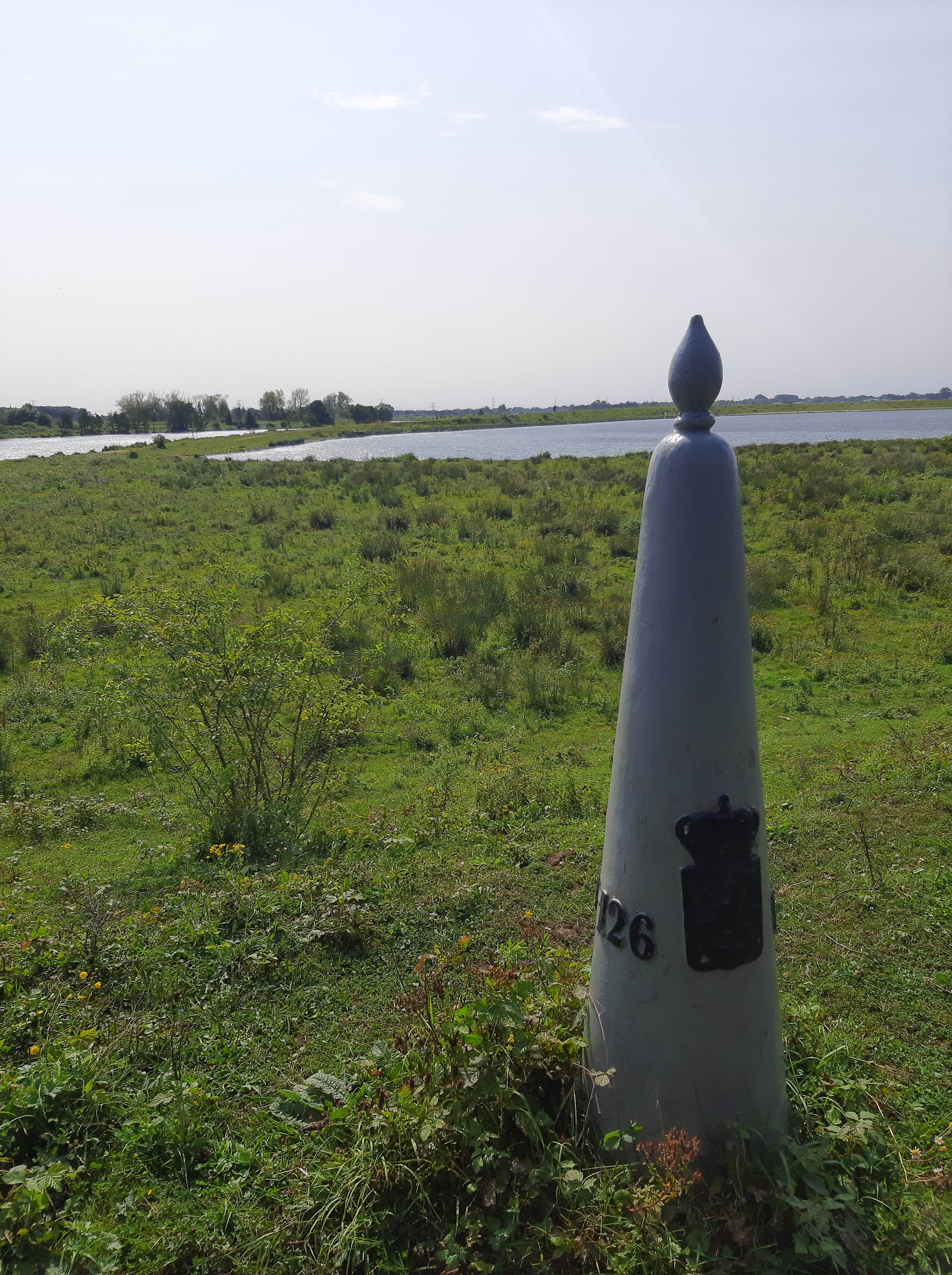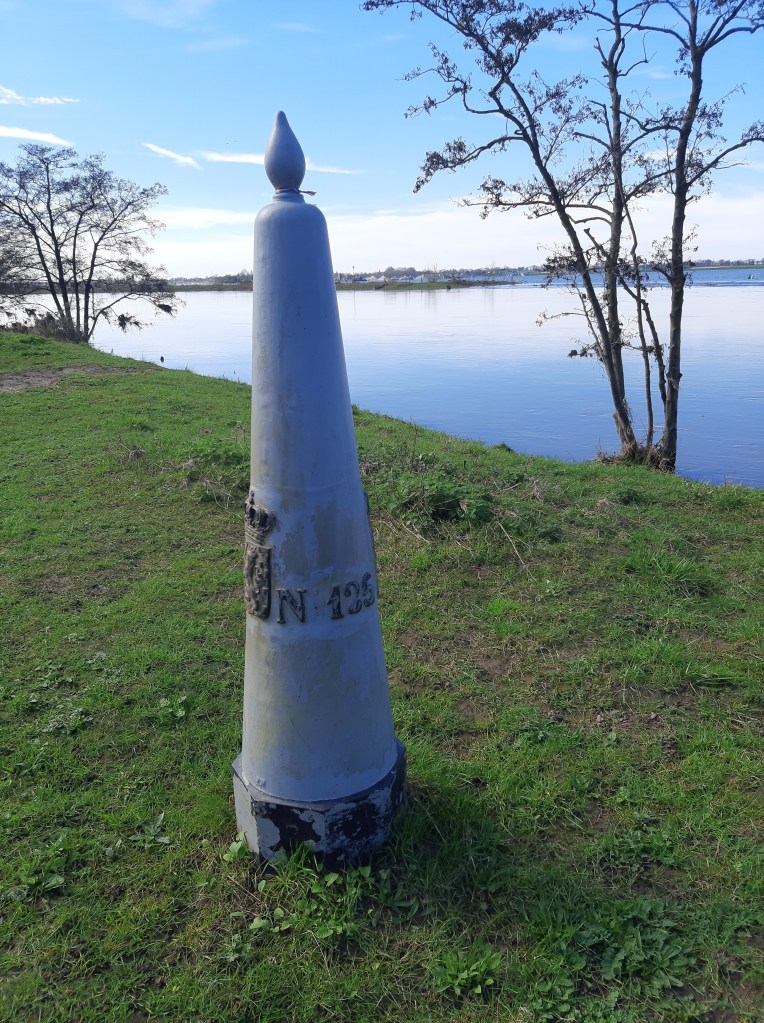 Wij wisten dit ook niet maar langs de Grensmaas tussen Eijsden en Thorn staan de grenspalen dubbel. Bij Thorn ontdekten we dit fenomeen: onze eerste twee Belgische grenspalen. Bij goed zicht zie je aan de overzijde van de rivier hun Nederlandse tweelingbroers.