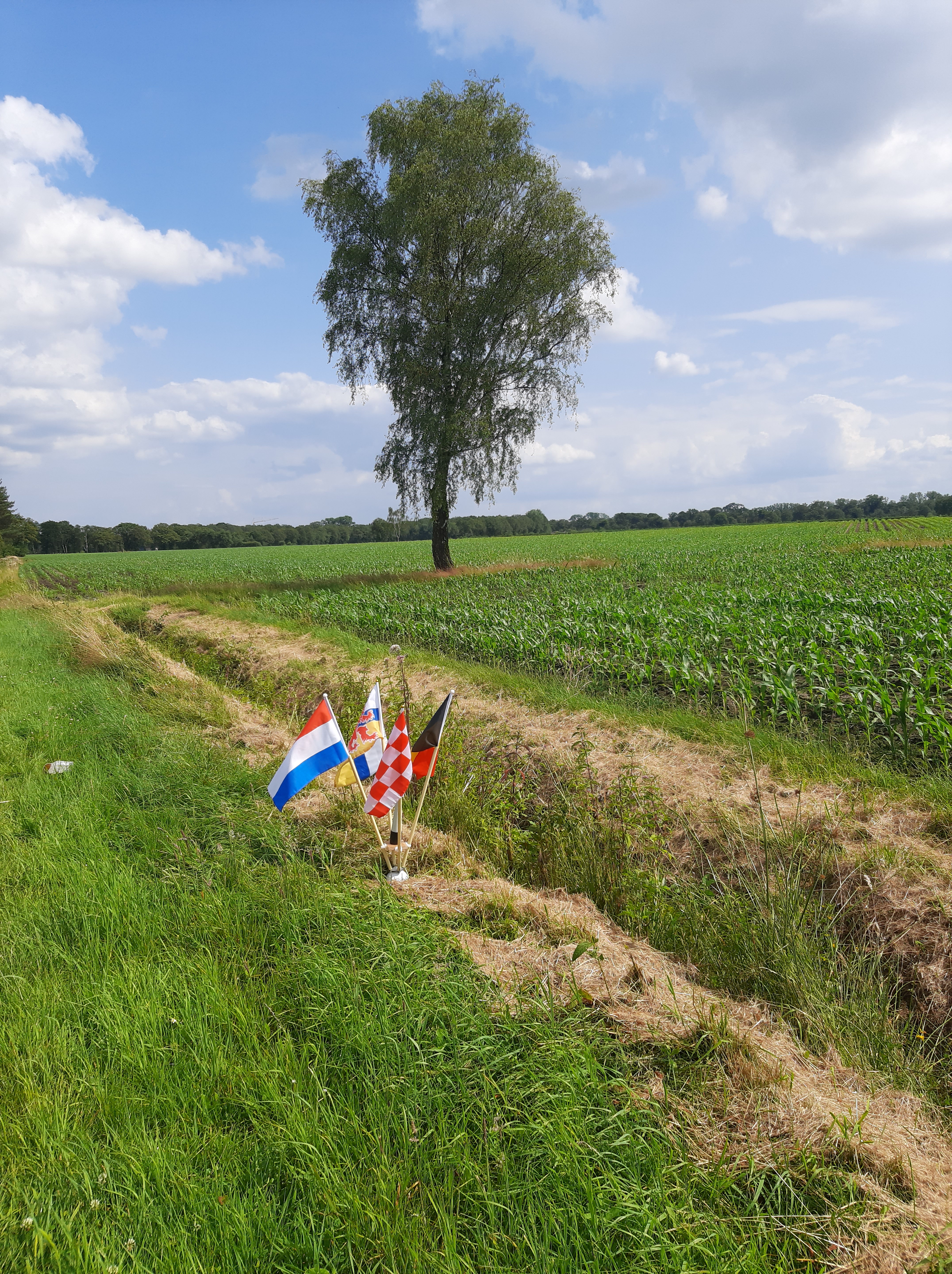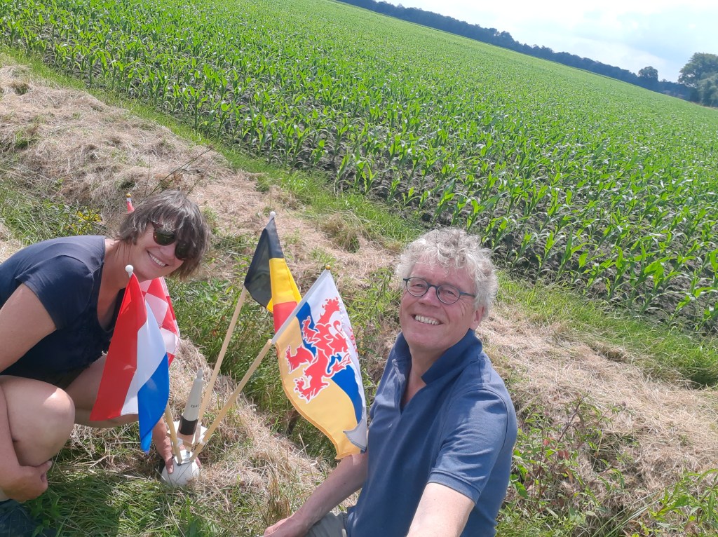 Wij hebben zelf het tripoint uitgemeten en exact op dat punt onze eigen grensmarkering geplaatst. De vier vlaggen wijzen in de juiste richting. Nu maar hopen dat hier toch nog ooit een echte steen of paal komt.