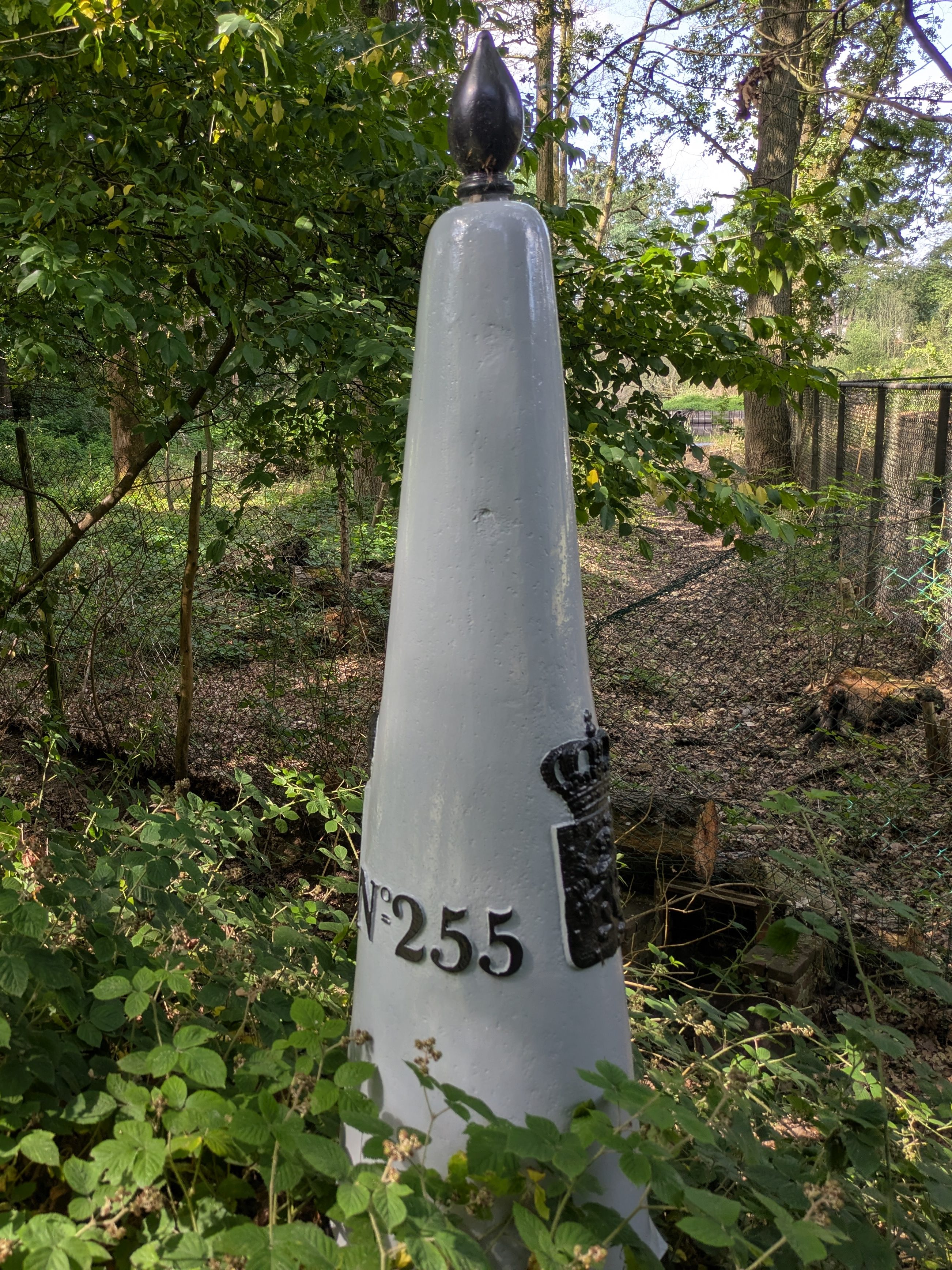 Bijzondere locatie. Op internet circuleren wel afbeeldingen maar deze grenspaal staat op een afgesloten privaat domein. Niet toegankelijk voor publiek en dat moeten we respecteren.